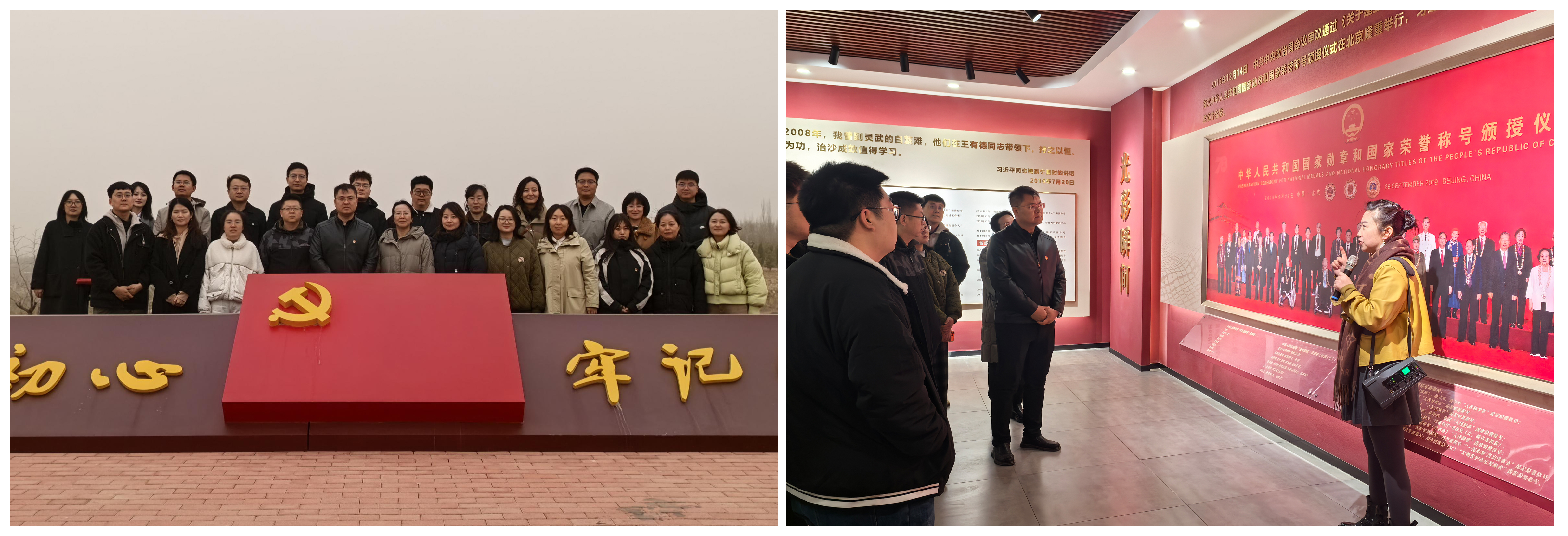 三、实地践学力行,汲取榜样力量。全体人员共同走进基金会红色教育长廊,通过劳模主题展馆、红色宣传画廊和党员教育基地的沉浸式学习,系统了解“人民楷模”王有德带领职工四十年如一日抗击毛乌素沙漠的奋斗史诗。展馆以草方格治沙模型、历史影像等载体,生动诠释“宁肯掉下十斤肉,不让生态落了后”和“生命不息,治沙不止”的精神丰碑,在讲解中深刻感悟榜样扎根一线、实干担当的奋斗精神。在后续开展的助农志愿服务中,进一步将理论学习成果转化为实际行动,在躬身实践中锤炼党性、践行初心,切实把正确政绩观的要求落到实处。